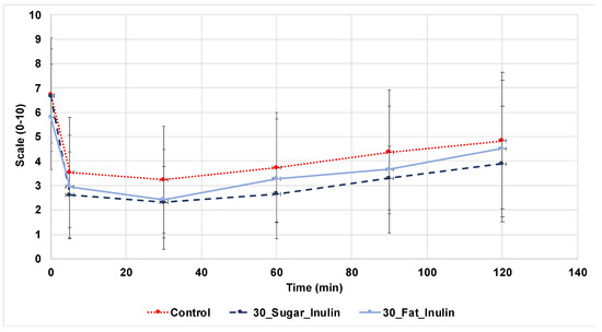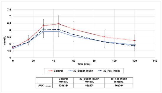 The iAUC (Figure 6) of glucose was significantly lower in 30_Sugar_Inulin and 30_Fat Inulin compared to control (F:1-12 = 129, p < 0.01). The mean glucose peak of control muffin was 6.46 ± 0.59 mmol/L, higher than 5.91 ± 0.44 mmol/L and 6.07 ± 0.33 mmol/L for 30_Sugar_Inulin and 30_Fat_Inulin, respectively. After 2 hours of muffins ingestion, the return to fasting blood glucose levels was faster with the reformulated muffins. Pairwise comparisons indicate no significant difference between iAUC of 30_Sugar_Inulin and 30_Fat_Inulin. The reduction of postprandial glucose between individuals may be attributed to the presence of soluble fibres that can slow the release of glucose by increasing the viscosity of the gut digesta and limit its interaction with digestive enzymes [59]. Soluble fibres can also reduce the postprandial glucose by slowing gastric emptying and decreasing the accessibility of a-amylase to the substrate (starch) [60]. Brennan et al. (2004) [61] found that adding inulin to pasta at (2.5 g, 5.0 g, 7.5 g, 10.0 g/100 g flour) had reduced the predicted glycaemic index (in vitro) by 2.3–15%. Borczak et al., (2012) [62] found that a significant 35% reduction in in vivo glycaemic index of bread rolls was possible when inulin (added at 2.5%) was coupled with a freezing process of these rolls (−18 °C for 14 days) where resistant starch type3 was allowed to form. Moreover, Lightowler et al. (2018) [63] found a linear correlation (r = 0.990, p < 0.001) between post prandial glucose reduction and inulin-type fructans when used in substitution of sugar in several foods and drinks. In fact, the latter found that reduction of 30% sugar in yogurt and fruit jellies using inulin had decreased the total iAUC120 min by 14% and 16%, respectively.