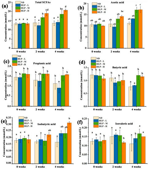 | Isobutyric acid (mmol/mL) | 0.26 ± 0.01a | 0.36 ± 0.04 a | 0.15 ± 0.02 a | 2.32 ± 0.13 c | 3.15 ± 0.58 d |