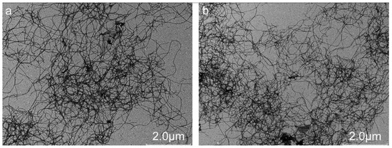Transmission electron microscopy image of whey protein isolate nanofibrils prepared by (a) the conventional method and (b) microwave heating.