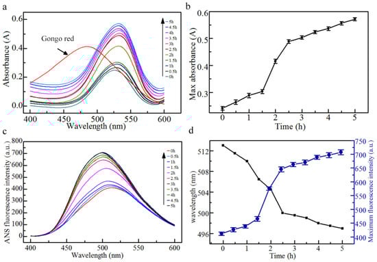 Since the surface hydrophobicity of WPNFs is closely related to their function and application, it is valuable for understanding its surface properties. As a commonly used hydrophobic probe, ANS was used to evaluate changes in hydrophobicity during the formation of WPNFs [26]. As the ANS bound to the protein, the emission fluorescence intensity was enhanced, and the fluorescence wavelength was blue-shifted (Figure 2c,d). The hydrophobicity of the surface increased rapidly after a slow start within 0–2.5 h, and increased slowly after 2.5 h, which coincided with the three stages of Congo red spectral analysis. It is therefore reasonable to assume that the reason for the higher surface hydrophobicity of WPNFs is the exposure of hydrophobic patches that accompany its formation. This assumption is consistent with the results of Mohammadian et al. [8]. Based on the results of the surface hydrophobicity measurements, the reason for the higher binding capacity may be the easier formation of inter- and intra-molecular links between the WPNFs and the oil [38].