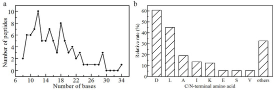 In order to characterize the building blocks of WPNFs, the amino acid sequence of WPNFs was determined by LC-MS/MS. The original mass spectrometry data were checked by Proteome Discoverer in UniProt protein database (species setting cattle) (Table S1). The identified building blocks of WPNFs consisted of 89 peptides, of which 4 were from α-Lipoic acid and 85 were from β-lactoglobulin. The lengths of the peptide chains of the identified WPNFs are shown in Figure 3a. Numerous identified short peptides confirmed that WPNFs were composed of hydrolysates rather than original proteins. Peptides 9–19 bases in length accounted for 75% of those identified, indicating that peptides with a suitable length were flexible in solution to facilitate aggregation. In addition to the sequences identified for the first time, some were consistent with those identified by Akkermans [39].