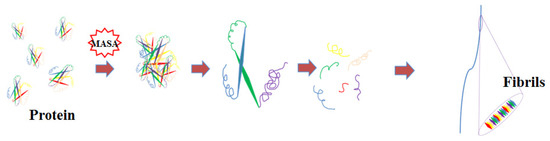 Most preparation methods for PNFs are focused on a conventional heating method—that is, heating acidified protein solutions (commonly at pH 2.0) at over 80 °C for more than 10 h [19]. Microwave-assisted self-assembly (MASA) is the process of using the energy characteristics of microwaves to heat objects. Microwave irradiation can directly induce torsional vibrations in the protein backbone, and the secondary and tertiary structures of proteins are altered by denaturation and refolding [20,21]. On the other hand, MASA can selectively break peptide bonds and form small peptides of terminal aspartic acid that are the building blocks of PNFs [22,23,24]. Therefore, it may be possible to use MASA to accelerate the formation of PNFs rapidly. Hettiarachchi et al. reported that β-lg nanofibers could be prepared by MASA, which was different from the conventional heating [22]. Lee further investigated the formation of oligomeric amyloid aggregates under microwave irradiation conditions and found that amyloid oligomers were formed within 7 min [20]. In our previous study, WPI formed WPNFs in 4 h using MASA [4]. Compared with conventional heating methods, MASA can be used to obtain the same or better quality fibers in a shorter period of time.