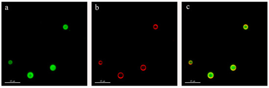 Figure 6 shows the super resolution image of the emulsion sample. The oil droplets were stained with Nile red, which appears green in the image. WPNFs were stained with rhodamine isothiocyanate B, which appears red in the image. The more intense the red color, the higher the amount of WPNFs. As shown in Figure 6b, the samples showed a distinct red color and almost completely wrapped the green area shown in Figure 6a, indicating that WPNFs combined well with oil droplets. These results indicate that WPNFs can effectively prevent the collision and aggregation of oil droplets and that WPNFs participate in the formation of Pickering emulsion.
