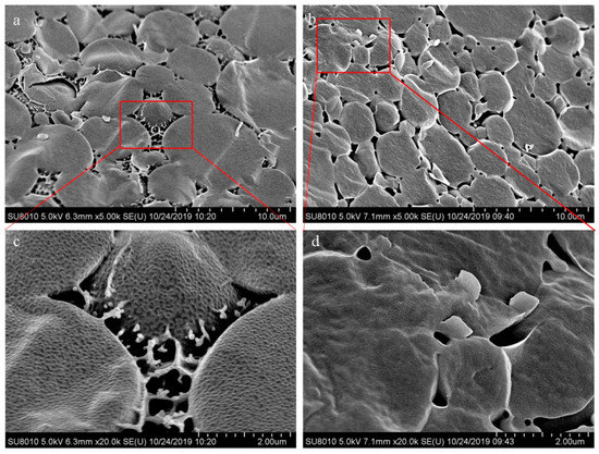 The Cryo-SEM images of the emulsions are shown in Figure 7. The droplet structures of both WPE and WFPE were relatively intact and did not collapse. In the amplified surface morphology of WPE (Figure 7c), the surface of the WPE droplet was coated with a dense layer formed by WPI protein nanoparticles, in accordance with Persson’s results [40]. Interestingly, the structure of WFPE and WPE is consistent with the micellar structure of the particles prepared by Wiacek, i.e., the tightly packaged circular regions (cores) were surrounded by the crown consisting of radially located scaffolding layers (shells) [41]. Nevertheless, some of the boundaries between WPE droplets tended to join and disappear, which might be the main cause of poor stability. WPNFs formed a smoother layer (Figure 7d), which was significantly different from the tight arrangement of protein nanoparticles on the surface of WPE droplets. The obvious and clear boundaries between the droplets made WFPE more stable than WPE [42]. Compared with the original protein, PNFs with a proper aspect ratio and flexibility could form stable and viscoelastic interfacial layers, which formed the physical barrier to prevent coalescence during emulsification [34,43,44]. Meanwhile, due to the increased surface hydrophobicity, WPNS can irreversibly adsorb to the interface and tightly wrap the oil phase, so that the droplet looks more like a regular ball and its size is smaller [38].