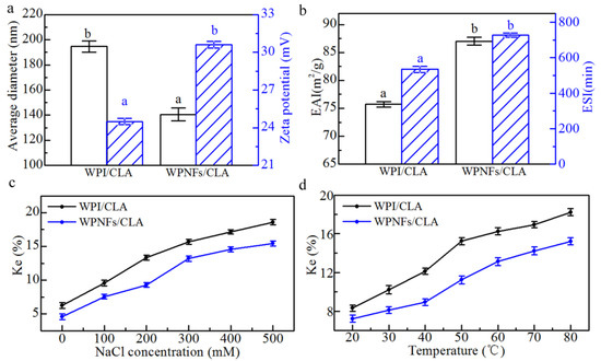Dynamic light scattering, emulsifying properties and emulsion stability of the emulsions. (a) Average particle diameter and zeta potential. (b) Emulsification activity (EAI) and emulsion stability (ESI) of the emulsions. (c) Effect of NaCl concentration on Ke of Pickering emulsions. (d) Effect of temperature on Ke of Pickering emulsions.