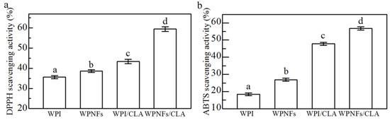 Figure 9 shows the DPPH and ABTS+ radical scavenging activity of WPI, WPNFs, WPE and WFPE. In emulsion systems, the rate of oxidation of LBI is directly influenced by the properties of each component. The provision of electrons and neutralization of free radicals by hydroxyl groups and certain amino acid residues introduced by hydrolysis during fibrosis gives WPNFs better DPPH and ABTS+ radical scavenging activity than WPI [55,56,57], which was one of the reasons why WFPE had higher antioxidant activity. On the other hand, as a direct result of the inherent antioxidant activity of CLA, both WPE and WFPE showed a greater increase in antioxidant activity than before they were combined with CLA. The Pickering emulsion stabilized by WPNFs improved the solubility of CLA in water, and WFPE exhibited good ionic strength stability, thermal stability and antioxidant activity. WEPE will have broad application prospects as a food delivery system for LBI substances.