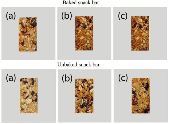 Figure 1. Binding ingredients (fructose, crystal sugar, and raisins) and dry ingredients were mixed and heated at 60 ± 3 °C. The dough was made into a rectangular shape with aluminum molds. Two common ways of processing were used, baking and no baking (cooling at room temperature).