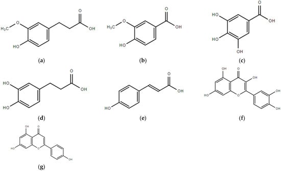 Typical phenolics in sorghum grains, (a) ferulic acid; (b) vanillic acid; (c) gallic acid; (d) caffeic acid; (e) p-coumaric acid; (f) luteolin; (g) apigenin.