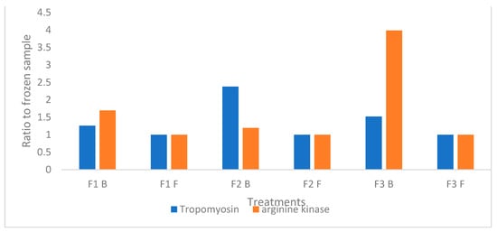 Liquid chromatography mass spectrometry (LC-MS) analysis of tropomyosin and arginine kinase in black soldier fly larvae extracts. Results represent means of three analyses and are a ratio relative to the frozen treatments. F1–Broiler-based diet; F2—Brewers grain (by-product); F3—Cereals grain (by-product); B—Blanched, F—Frozen.