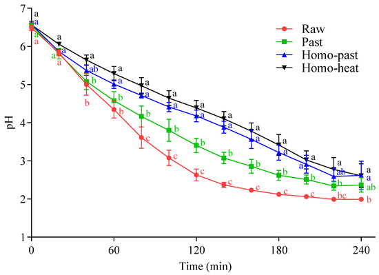 pH changes during the in vitro gastric digestion of differently processed sheep milks: ●, raw milk; ■, pasteurized (Past) milk; ▲, homogenized and pasteurized (Homo–past) milk; ▼, homogenized and heated (Homo–heat) milk. Different lowercase letters indicate significant difference (p < 0.05). Error bars represent standard deviations.