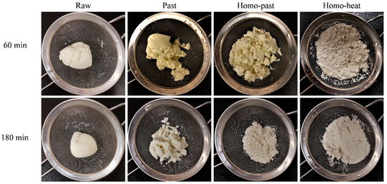 The appearance of the curds formed at different digestion times from differently processed sheep milks is shown in Figure 2. In all milk samples, protein coagulation was visible immediately after the addition of the milk into the SGF (20 mL of SGF with a pepsin activity of 2000 units/mL). After 60 min of digestion, a firm curd with a smooth surface was observed in both the raw milk and the pasteurized milk; at this stage, the serum phase became clear, indicating that most of the casein micelles and fat globules were incorporated into the curd. With further digestion to 180 min, the firm curds formed from the raw milk samples became smaller but remained integrated, whereas the curds formed from the pasteurized milk samples became less integrated and were broken into several small pieces with various sizes (Figure 2). However, the curds from the homo–past and homo–heat milks appeared to be more fragmented and looser than those from the raw and pasteurized milks throughout the gastric digestion. In the homo–heat sheep milk, the curd crumbles were much looser, smaller, and more evenly fragmented than those from the homo–past milk. These results indicated that homogenization and different levels of heat treatment of sheep milk could lead to the formation of differently structured curds.