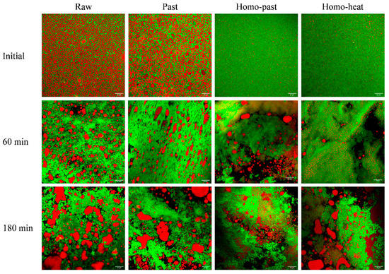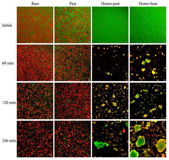 The structures of the milk curds formed from the raw, pasteurized, homo–past, and homo–heat sheep milks at different digestion times were determined using confocal microscopy (Figure 3). For all milk samples before digestion, the fat globules were evenly distributed in the protein aqueous phase, and the fat globule size in the homogenized milks appeared to be much smaller than that in the unhomogenized milks. At 60 min of digestion, a closely-knit network of protein matrix was observed in all milk samples, and many fat globules were also found within the protein matrix. Additionally, the size of the fat globules within the curd became larger during the digestion progress, compared with that in undigested milk samples, suggesting that aggregation and/or coalescence of the fat globules occurred because of the effect of hydrolysis by pepsin on the membrane proteins surrounding the fat globules [33,34].