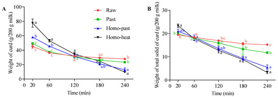 The weights of the curd and the total solids of the curds in all milk samples decreased gradually throughout the gastric digestion (Figure 4A,B). The initial (20 min) weights of the curds and the total solids of the curds followed the order raw < pasteurized < homo–past < homo–heat, indicating that homogenization and more intense heating resulted in the incorporation of more milk components into the curds. This was attributed to the whey proteins that associated with the casein micelles during the heat treatment [18]. Statistical analysis showed that there were significant differences in the weights of the curds between the homogenized (homo–past and homo–heat) milks and the unhomogenized (raw and pasteurized) milks (p < 0.01) and between the homo–past and homo–heat milks at 20 min (p < 0.05), whereas there were no significant differences in the weights of the total solids of the curds (p > 0.05), suggesting that more moisture might be retained in the curds formed from the homogenized and heated sheep milks. This result was in agreement with previous results, which showed that curds with a looser structure contained more liquid [18,36]. Thus, a curd with higher moisture content might contain more SGF and pepsin. With further digestion, the weights of the curds and the total solids of the curds decreased much faster in the homo–past and homo–heat sheep milks than in the raw and pasteurized sheep milks. Significant differences between each time point in the weights of the curds and the total solids were observed in the homo–past and homo–heat sheep milks (p < 0.05) but not in the raw and pasteurized sheep milks. At 240 min of digestion, both the weight of the curds and the weight of the total solids showed a reverse order compared with their initial weights: raw > pasteurized > homo–past > homo–heat. These results suggested that pasteurization alone of sheep milk did not have much impact on the breakdown of the curd compared with the raw sheep milk; pasteurization combined with homogenization significantly accelerated the disintegration of the sheep milk curds; more intense heat treatment of the homogenized sheep milk did not further impact the breakdown of the curds compared with the homo–past sheep milk but resulted in a significantly higher weight of the curds at 20 min.