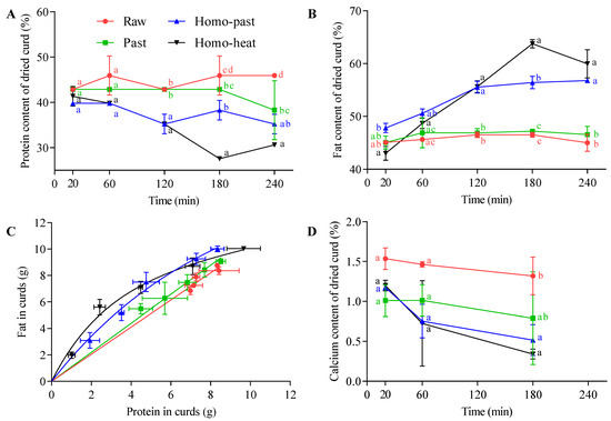 Changes in (A) the protein content of the dried curds and (B) the fat content of the dried curds, (C) the relationship between the amounts of fat and protein in the curds, and (D) the calcium content of the dried curds at different time points (20–240 min) during the in vitro gastric digestion of differently processed sheep milks: ●, raw milk; ■, pasteurized (Past) milk; ▲, homogenized and pasteurized (Homo–past) milk; ▼, homogenized and heated (Homo–heat) milk. Different lowercase letters indicate significant difference (p < 0.05). Error bars represent standard deviations.