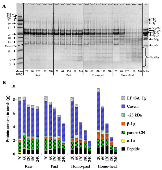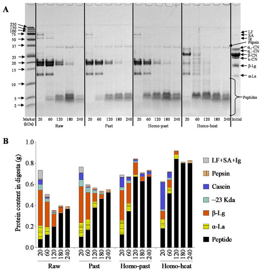 Differences were also found for the bands at ~14, 18, and 23 kDa, which correspond to α-La, β-Lg, and macropeptides, respectively. Within the first 120 min of digestion, there were low intensities of these bands (especially β-Lg) in the homo–heat sheep milk, whereas markedly higher intensities of these bands were observed in the other three types of sheep milk (Figure 8A). About 0.32, 0.34, 0.28, and 0.08 g of β-Lg were detected in the digesta obtained at 20 min for the raw, pasteurized, homo–past, and homo–heat milks, respectively (Figure 8B). The lower β-Lg content in the digesta of the homo–heat milk was attributed to the higher amounts of β-Lg that were incorporated in the curds (Figure 6) because of their association with the casein micelles after more intense heat treatment [42]. The β-Lg and α-La bands in all types of milk faded away gradually during the digestion and disappeared in the digesta emptied at 240 and 120 min, respectively, which is in agreement with the previous findings of Roy et al. [17]. The decreased intensities of the β-Lg and α-La bands could have been due to the dilution by the continuous addition of SGF and the hydrolysis by pepsin when the pH was less than 4 [43].