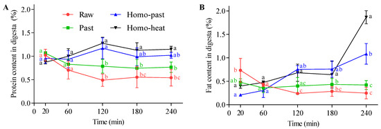 The protein contents of the digesta emptied from the stomach at different digestion times from the different milk samples are shown in Figure 7A. The protein contents of the unhomogenized milks decreased gradually during 120 min of digestion, after which they remained roughly constant at ~0.41% for raw milk and ~0.69% for pasteurized milk towards the end of the digestion. However, the homo–past and homo–heat sheep milks showed the opposite trend, with the protein contents of the digesta initially increasing in the first 120 min of digestion, with little change on prolonged digestion. At digestion times of longer than 120 min, the protein contents of the digesta of the homo–past and homo–heat sheep milks were significantly higher than those of the raw and pasteurized milks (p < 0.05). The fat contents of the digesta are shown in Figure 7B. Those in the raw and pasteurized sheep milks decreased slightly during the first 120 min of digestion and then stayed almost unchanged on prolonged digestion, whereas the homo–past and homo–heat sheep milks showed an increasing trend over the whole digestion.
