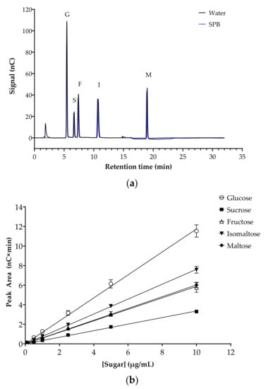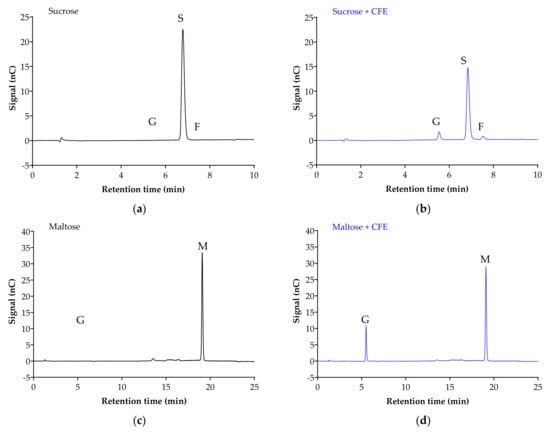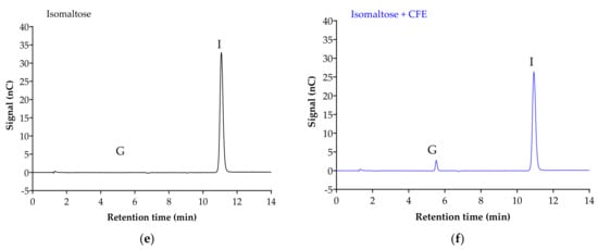 Figure 2 displays the chromatogram of the sugar standards with efficient separation in a single 32-min elution, with good resolution. To analyze the efficiency of the enzyme reaction and sample extraction, substrates with or without cell-free extract (CFE) were digested, extracted and analyzed accordingly. The representative chromatograms in Figure 3 show the breakdown of sucrose into glucose and fructose (Figure 3a,b), and the breakdown of maltose (Figure 3c,d) and isomaltose (Figure 3d,e) into glucose was detectable with good resolution only when the relevant enzymes were present.