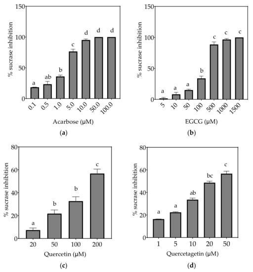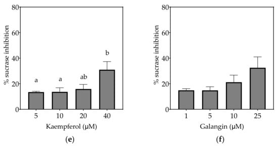 Inhibition of sucrase in Caco-2/TC7 cell-free extracts, using sucrose as the substrate, by (a) acarbose (positive control), (b) EGCG, (c) quercetin, (d) quercetagetin, (e) kaempferol and (f) galangin. Data are mean ± SEM, n ≥ 2 injections, for three different CFEs. Specific activity was calculated and relative inhibition was determined by comparing to the controls containing substrate and enzyme only. Values with different letters indicate significant differences (p < 0.05).