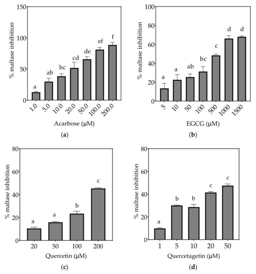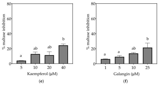 Inhibition of maltase in Caco-2/TC7 cell-free extracts, using maltose as the substrate, (a) acarbose (positive control), (b) EGCG, (c) quercetin, (d) quercetagetin, (e) kaempferol, and (f) galangin. Data are mean ± SEM, n ≥ 2 injections, for three different CFEs. Specific activity was calculated and relative inhibition was determined by comparing to the controls containing substrate and enzyme only. Values with different letters indicate significant differences (p < 0.05).