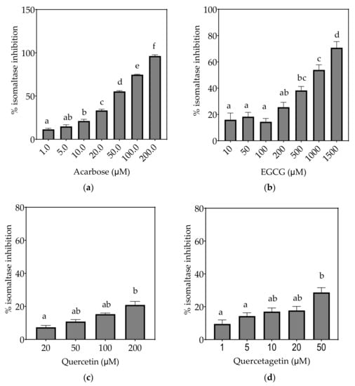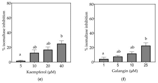 Inhibition of isomaltase in Caco-2/TC7 cell-free extracts, using isomaltose as the substrate, by (a) acarbose (positive control), (b) EGCG, (c) quercetin, (d) quercetagetin, (e) kaempferol and (f) galangin. Data are mean ± SEM, n ≥ 2 injections, for three different CFEs. Specific activity was calculated and relative inhibition was determined by comparing to the controls containing substrate and enzyme only. Values with different letters indicate significant differences (p < 0.05).
