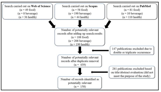 A total of 586 papers were identified, 292 papers at Scopus (190 beverage, 58 food, and 44 pharmaceutical health), 201 papers at PubMed database (10 beverage, 81 food, and 110 pharmaceutical health), and 93 papers at Web of Science (8 beverage, 49 food, and 36 pharmaceutical health). Each paper was obtained and evaluated individually. Of these, 147 were duplicates or triplicates and were excluded. A total of 439 remained after the exclusion of repeated papers. After screening the titles and abstracts, only 158 papers were adequate for the study (Figure 1).