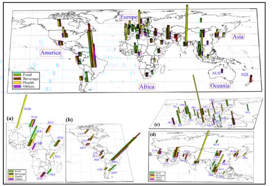 Initially, all possible applications for MDs around the world were considered. According to the data set, Figure 2 shows the countries and their continents that most used MDs in the beverage, food, pharmaceutical health, and other science in the last five years.