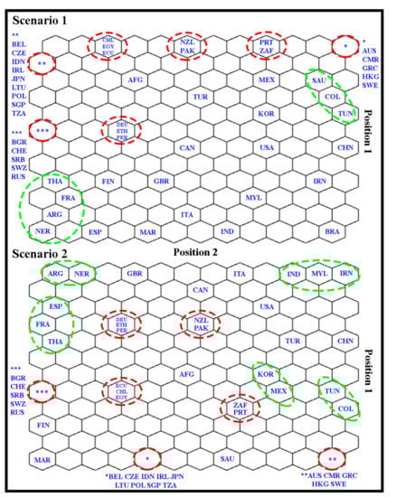 In Figure 3, the network indicated the formation of 9 clusters for scenario 1, while in scenario 2, the number of clusters increased to 12. These clusters highlighted in red in scenarios 1 and 2 represent the countries classified in the same winning neuron, i.e., these countries have the same importance when using MDs. However, empty neurons between these clusters indicate that these groups of countries have different importance. For example, the cluster from Bulgaria (BGR), Chile (CHE), Serbia (SRB), Eswatini (SWZ), and Russia (RUS) differs more from the cluster from Australia (AUS), Cameroon (CAM), Greece (GRC), Hong Kong (HKG) and Sweden (SWE), when compared to the cluster from Germany (DEU), Ethiopia (ETH) and Peru (PER). This same observation can be made for the other clusters.