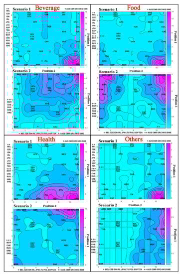 Figure 4 shows the weight map of the food variable for the two scenarios. In scenario 1, the food variable presented the same behavior as for the beverage area. In this field, Brazil (BRA) again presented more publications. Other countries with significant amounts of food area publications were Iran (IRN), Malaysia (MYL), China (CHN), Thailand (THA), France (FRA), Spain (ESP), Argentina (ARG), and Nigeria (NER), represented by the Asian, European, American, and African continents, respectively. Peru (PER), Finland (FIN), Colombia (COL), among other countries represented by the same color scale, presented fewer quantities of publications (n = 1). Countries such as Afghanistan (AFG), Portugal (PRT), Morocco (MAR), among others represented by the same color scale, did not have work in the area.