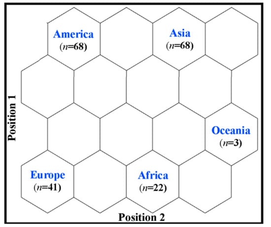 In Figure 5, the countries with the largest publications are presented at the top of the distribution map, represented by America (n = 68) and Asia (n = 68). At the bottom of the map, the continents with the lowest quantities, represented by Europe (n = 41), Africa (n = 22), and Oceania (n = 3). In addition, the bottom part of the distribution map indicated that these three continents could be separated decreasingly from left to right.