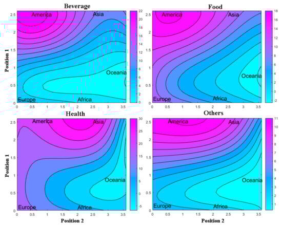 After analyzing the topological map that represents the countries distributed in each winning neuron (Figure 3), the respective weight maps for application areas of the MDs were generated, shown in Figure 4. Further discussion for each area will be given in the following sections. The weight maps represent the topological map overlay for the continent’s segmentation, and the color scale indicates the observed values for the input variables.