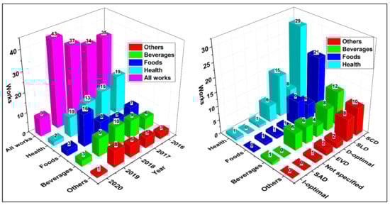 Overall, Figure 7 shows that MDs have been increasingly applied in different areas of knowledge over the years, being more applied in the pharmaceutical health area, followed by the food and beverage areas. In this sense, researchers have applied MDs to improve processing conditions, new product development, or obtain unique sensory and physicochemical characteristics in products, among other numerous applications described briefly in the following sections.