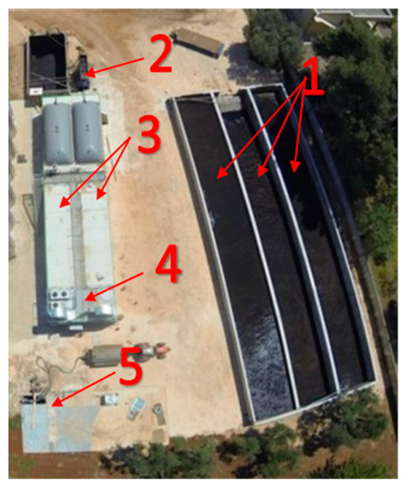 Overview of the full-scale anaerobic digestion plant. (1) biomass storage tanks; (2) loading hopper; (3) plug-in digesters; (4) cogenerator engine; (5) cogenerator biogas line.