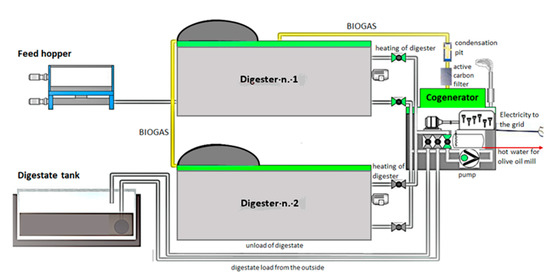 A scheme of the plant is reported in Figure 2. The produced biogas is used by the CHP (100 kWe) to generate electricity and heat. The thermal energy of the engine is recovered in the form of hot water, used for the thermostatic control of the digestion system throughout the year, as well as for the needs of the olive oil extraction plant and the households during the winter months. The produced electricity can be used for self-consumption to meet the needs of the digestion system and the surplus is sold to the national electricity grid.