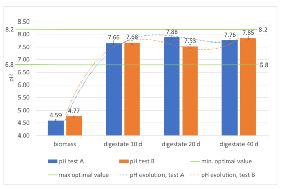 The trend of the pH (Table 2; Figure 5) and of the ratio between volatile organic acids and alkalinity (FOS/Alk) shows the remarkable stability of the process. The FOS/Alk ratio (Table 2) is particularly indicative: it is always lower than 1 and tends to decrease significantly in the second digester, showing that the methanogenic phase is quite stable and the probable evolution of the bacterial population towards the methanogenic component occurs in the second reactor. At the same time, starting with pH values of 4.59–4.77 (Table 2; Figure 5) that characterize the incoming biomass, optimal pH values are reached for the production of methane since the acidogenic phase, which occurs in the first digester. Therefore, the biomass pH, the acid at the entrance of the first reactor, tends to neutrality just after 10 days of processing and remains almost constant (except for very small variations) throughout the remaining processing period. The final values of both tests, 7.76 and 7.85 respectively (Table 2; Figure 5), are largely compatible with the requirements related to digestate distribution on soil [35].