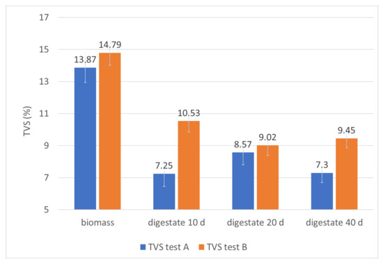 The fixed residue (STF) remains significantly unchanged between the incoming biomass and the final digestate (Table 2: samples A4 and B3). In fact, it changes from 1.31% to 1.76% at the beginning of both test A and test B (Table 2), then at the exit of the first reactor is 1.43% for test A and 1.47% for test B (Table 2) and at the output of the second reactor is 1.5% and 1.33% for the tests A and B respectively. This explains why the process, taking place correctly, tends to consume the organic substance, so the relative quantities of the ash do not increase. In fact, the total volatile solids (TVS), passing from the biomass entering the final digestate, decrease from 13.87% to 7.3% in the first test and from 14.79% to 9.45% in the second test (Table 2; Figure 6), suffering a reduction of 47.37% in the first test and 36.11% in the second test. This confirms that in both cases an effective biogas conversion of the organic substance was obtained, as well as a significant reduction of the organic pollutant load of the biomass. However, it should be specified that a more effective metabolic activity of the anaerobic bacteria on a mixture consisting exclusively of pitted pomace and olive pulp is related to a greater presence of aggregates in the biomass of the second test, which leads to lower values of the metabolized organic load.