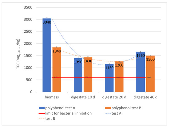More precisely, in the second reactor methanogenic bacterial strains were selected that became resistant to polyphenols. Finally, they also help solubilization, confirming the slight TPC increase, a phenomenon that can occur in fermentation at full scale [37]. It is not to be excluded that methanogenic bacteria that degrade polyphenols have been selected, removing them from the substrate, but this possibility is less hypothetical because, in this case, the polyphenols would decrease.