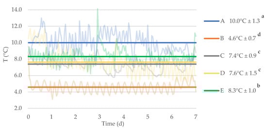 Temperatures (°C) recorded in the five domestic refrigerators (A to E) during one week. Values on the right are given as mean ± SD (n = 168). Faded lines represent the temperature profiles (data recorded at 1-h intervals), while the bold horizontal lines indicate the mean values measured for each household. Different superscript letters in the legend indicate significant differences (p < 0.05) among mean values.