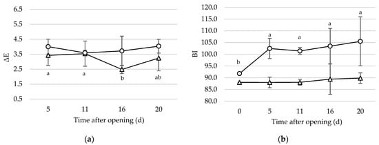 (a) Overall color variation (ΔE) and (b) Browning Index (BI) for pesto 1 (triangle) and pesto 2 (circle) during household storage after first opening. Each line reports the mean value of samples from the five households and managed under the two scenarios. Different letters within each line indicate significant differences (p < 0.05). If letters are not provided, no significant difference was observed.