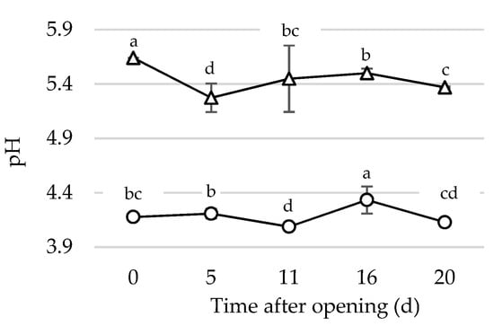 The monitoring of pH (Figure 3) did not show significant differences based on the level of domestic use in both pesto sauces (p = 0.21 and 0.06 for P1 and P2, respectively), therefore the values from both scenarios were analyzed together. Very small changes, though statistically significant, were shown during the period after first opening (p < 0.05) in both pesto brands. In spite of that, the pH of Pesto samples after 20 d from the first opening was very similar to the initial one, thus confirming the intrinsic stability of the products.