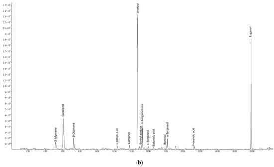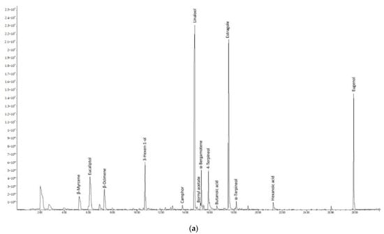 Figure 4 shows typical chromatograms of pesto (Figure 4a for P1 and Figure 4b for P2, respectively). Overall, more than 70 peaks were identified, mostly related with basil volatile composition. Slight differences occurring in the volatile profile of P1 and P2 result from the differences in formulation (as reported in the Materials and Methods section). Among the major peaks, linalool, estragole (or methyl chavicol, only in P1), eugenol, eucalyptol, trans-α-bergamotene, trans-β-ocimene, β-myrcene arise from basil [28,29], as the major ingredient in pesto formulation, representing about 72–83% of the overall chromatographic area.
