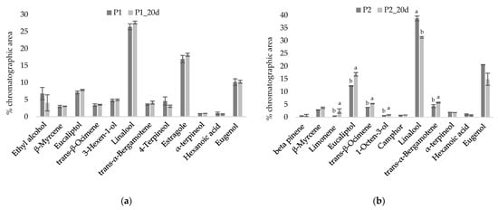 Comparison of the main volatile components (relative abundance) of (a) P1 and (b) P2 analyzed at the time of first opening and after 20 days from first opening (under S2). Different letters for each compound indicate significant differences (p < 0.05). If letters are not provided, no significant difference was observed.