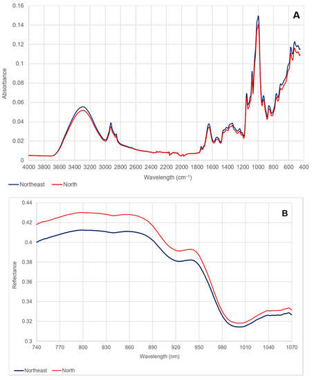 Mean raw FTIR-ATR (A) and NIR (B) spectra of Thai Hom Mali rice from the northern and northeastern regions (year 2019). Spectra from 2018 are similar and are not shown.
