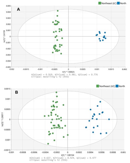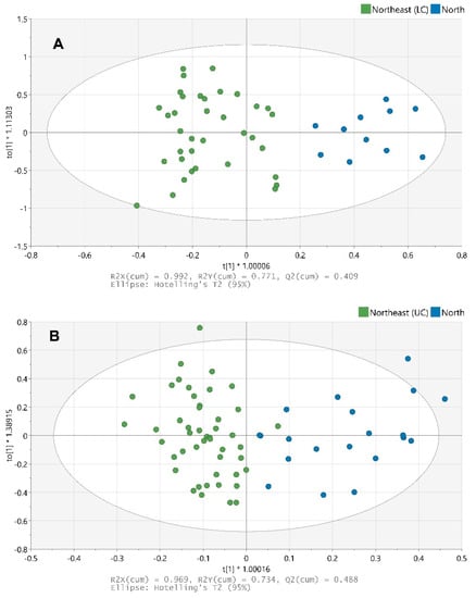 OPLS-DA allowed for a clear differentiation between the rice samples from the northern and northeastern regions in both production years (Figure 2). The goodness of fit (R2) and the predictive ability (Q2) of the OPLS-DA model are shown in Table 2.