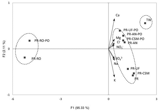 To present overall sample loading to the two-dimensional plot, a PCA was conducted (Figure 2). The PCA plot explained 97.44% of the total variations (F1: 95.33%, F2: 2.11%). Additionally, the samples were grouped into three clusters according to the AHC analysis. The TW was on the right side of the plot, which meant that the TW had the highest contents of minerals and anions. PR with UF, CU, and AN filtered samples were grouped together, and the RO filtered samples were on the left side of the plot, which meant that the RO filtered most of minerals and anions.