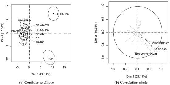 Sensory quality is one of key factors in accepting and rejecting foods and beverages. Even if a certain food is considered healthy and nutritious, consumers reject tasting the food if it has a bad odor. An “off-flavor” of the water is the main reason for rejecting drinking water [7]. Therefore, appropriate sensory properties of drinking water are key to ensure that people drink water, which is especially relevant since TW contains VOCs resulting from the filtration process. Thus, consumers react to VOCs in TW and determine whether to drink it or not [1,2]. SP methods with open-ended questions regarding the perceived taste of the samples were conducted to investigate how consumers discriminate purified TW in the holistic approach. Discrimination of purified water samples using the PSP method is shown in Figure 3. The purified water samples were divided into three groups (Figure 3a). The TW and PR-RO-PO samples were located at the bottom-right and top-right corners, respectively. The remaining samples were located slightly left in the central area of the plot. The subjects did not discriminate samples clearly, other than the TW and PR-RO-PO samples. Therefore, the effects of the main filter types and PO treatment were limited in the discrimination of purified water, other than the PR-RO-PO. Since the PSP method distinguished the samples according to their holistic characteristics, the reason for the difference cannot be identified [24]. To address this issue, each subject was asked an open-ended question for each sample that was used as supplementary data (Figure 3b). Sensory characteristics with a cos2 >0.7 were selected, namely tap water flavor, saltiness, and astringency. The subjects easily identified TW after drinking. The perceived taste difference in the PR-RO-PO samples from the other purified water may be due to the reservoir in the system rather than the VOCs in the sample. The home RO system has a reservoir because the RO requires significant time to purify water due to its low efficacy compared to other filters [32]. The reservoir in this study was connected to the filter using a narrow pipe and tightly sealed to discharge the stored water using the difference in pressure. The metallic inner surface of the reservoir could negatively influence the taste of water. The significantly higher conductivity of PR-RO-PO supported the results of the PSP test (Table 1). The difference between the PR-RO and PR-RO-PO samples was due to the direct collection of the PR-PO sample prior to storage in the reservoir.