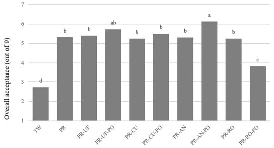 The results of the consumer acceptance test for purified water are shown in Figure 4. The overall acceptance rates of the samples were significantly different across samples (p < 0.05). TW had the lowest acceptance, at 2.72 out of 9, and 67.8% of the consumers correctly identified TW from the open-ended question. The higher concentration of VOCs in TW (Table 2) seemed to cause its identification and lower acceptability. Although determining whether the subjects would drink tap water was not part of the pre-questionnaire, they drank filtered water, which has a lower concentration of VOCs during working hours. The off-flavor generated during the filtration process was easily identified in this study. The subjects appeared to recognize that the off-flavor was generated during the filtration process, and its chemical characteristics resulted in the subject rejecting the TW. Water is a bland sample, so minimizing negative characteristics is the key in increasing acceptability, as in a previous study that evaluated cooked rice [33]. PR-AN-PO samples had the highest acceptance rating of 6.13. The other purified samples scored 5.24–5.73 out of 9, and were not significantly different (p < 0.05), other than the PR-RO-PO samples. Attaching PO did not influence the acceptance of purified water quality (Table 2). However, the PR-RO-PO sample had the lowest acceptance rating of 3.83 out of 9. The PR-RO-PO sample was also clearly distinguished in the PSP test (Figure 3a), with consumers highlighting notable characteristics in the sample. Of the consumers, 34.4% commented on a medicinal, metallic, or bitter taste for the PR-RO-PO samples, while 11.1% commented on these characteristics for the PR-RO samples in the open-ended questions of the consumer test (results not shown).