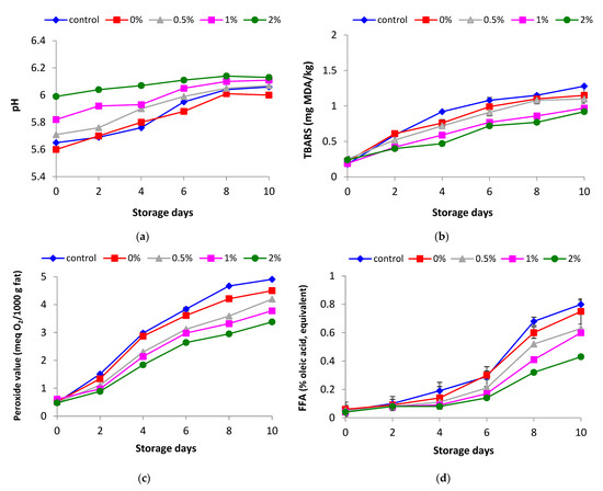 Effect of different concentrations of LMWCH (%) on pH (a), TBARS (b), peroxide (c), and free fatty acid (d) values in low-fat beef burger and control sample during 10 days of storage in the refrigerator (4 °C).