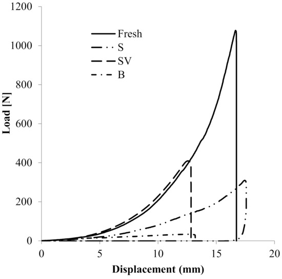 Load bearing ability was first evaluated by analyzing the relationships between load and displacement in the range of pre-failure deformation. Texture softening induced by the heat was examined by comparing the changes observed in the compression curves corresponding to the cooked samples with respect to the fresh (untreated) ones. Figure 1 shows the compression curves corresponding to the fresh and 25-min heated Cheddar cauliflower under boiling (B), steaming (S) and sous-vide (SV).