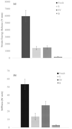 Figure 2 shows the strain energy release and stiffness levels corresponding to the fresh and 25 min heated Cheddar samples under B, S, and SV conditions.