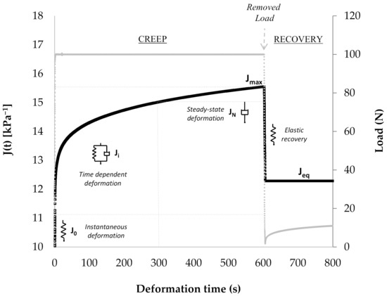 Creep and recovery tests were conducted under small-deformation conditions. A creep load target of 100 N was reached during loading step by imposing high crosshead speed (600 N/min) and kept for 600 s (10 min), and then the target load was removed, and the displacement was informed for 600 s (10 min) during the unloading step, allowing the equilibrium recovery in the residual structure.